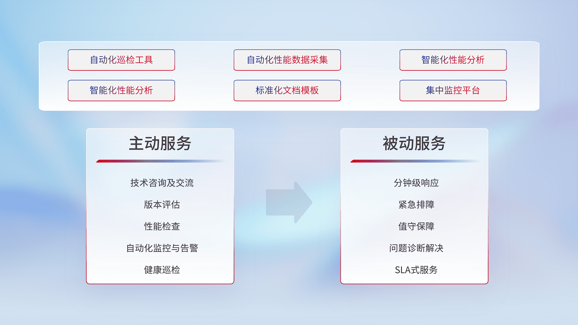 智能化工具和标准化文档,,保障服务质量,,,,提供主动服务(包含技术咨询、、版本评估、、、、性能检查、、、、自动化监控与告警、、健康巡检)和被动服务包含(分钟级响应、、、紧急排障、、值守保障、、、、问题诊断解决、、、、SLA服务)。。。。